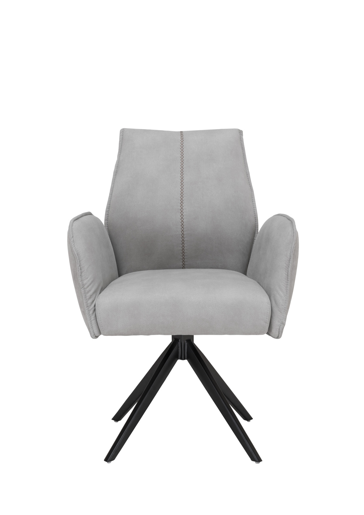 Eine kantige Rückenlehne kombiniert mit abgerundeten Armlehnen fügen sich zusammen mit einem schlichten, grauen Stoff mit XX Ziernaht überzogen, zu einem harmonisch designten Stuhl. Die Sitzschale wird getragen von schwarzen, pulverbeschichteten Füßen aus Metall, die nach außen auslaufen.