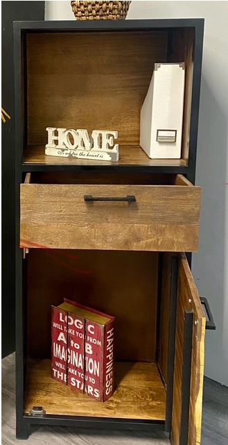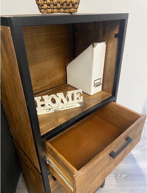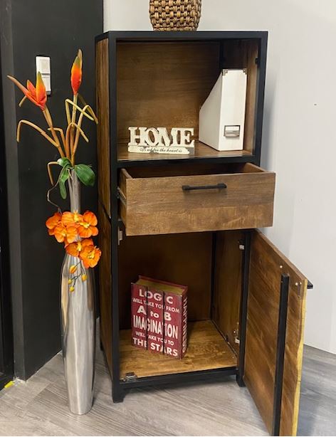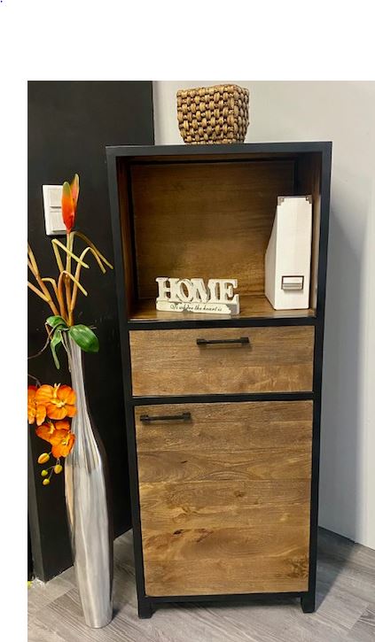 Ein attraktiver Blickfang in Ess- oder Wohnzimmer ist dieses Schrank aus Mangoholz, abgesetzt mit schwarzem Metall.