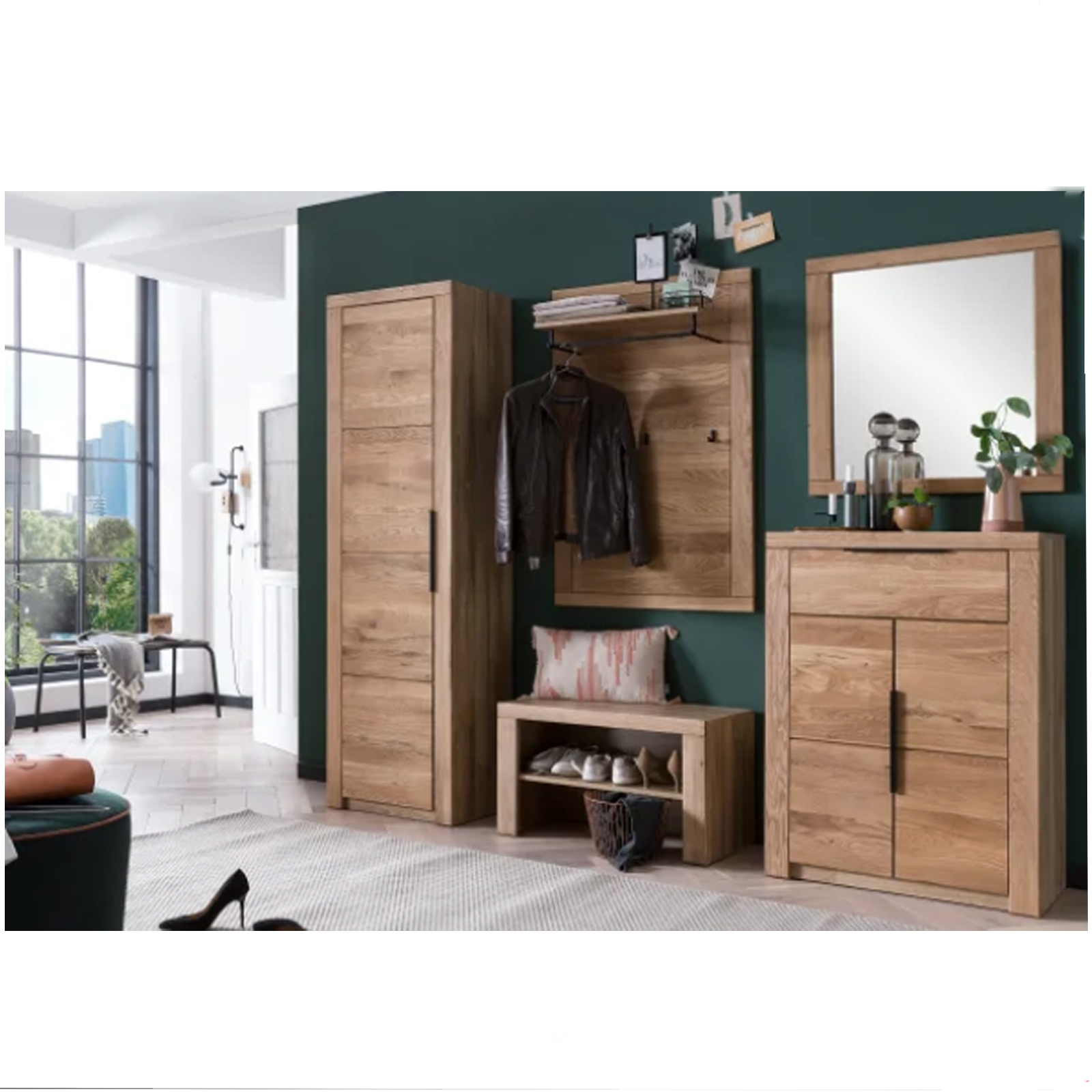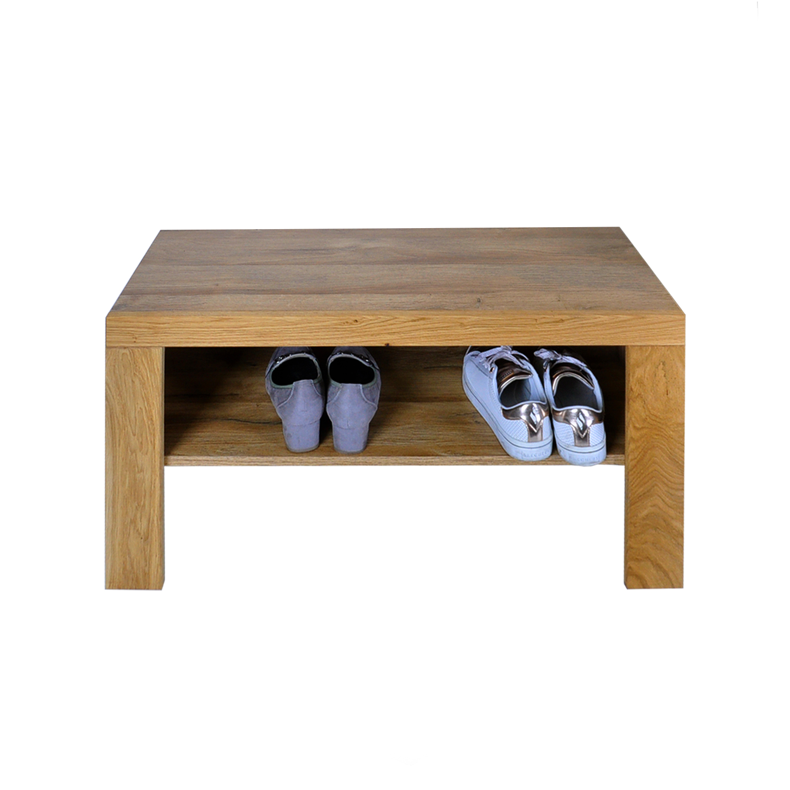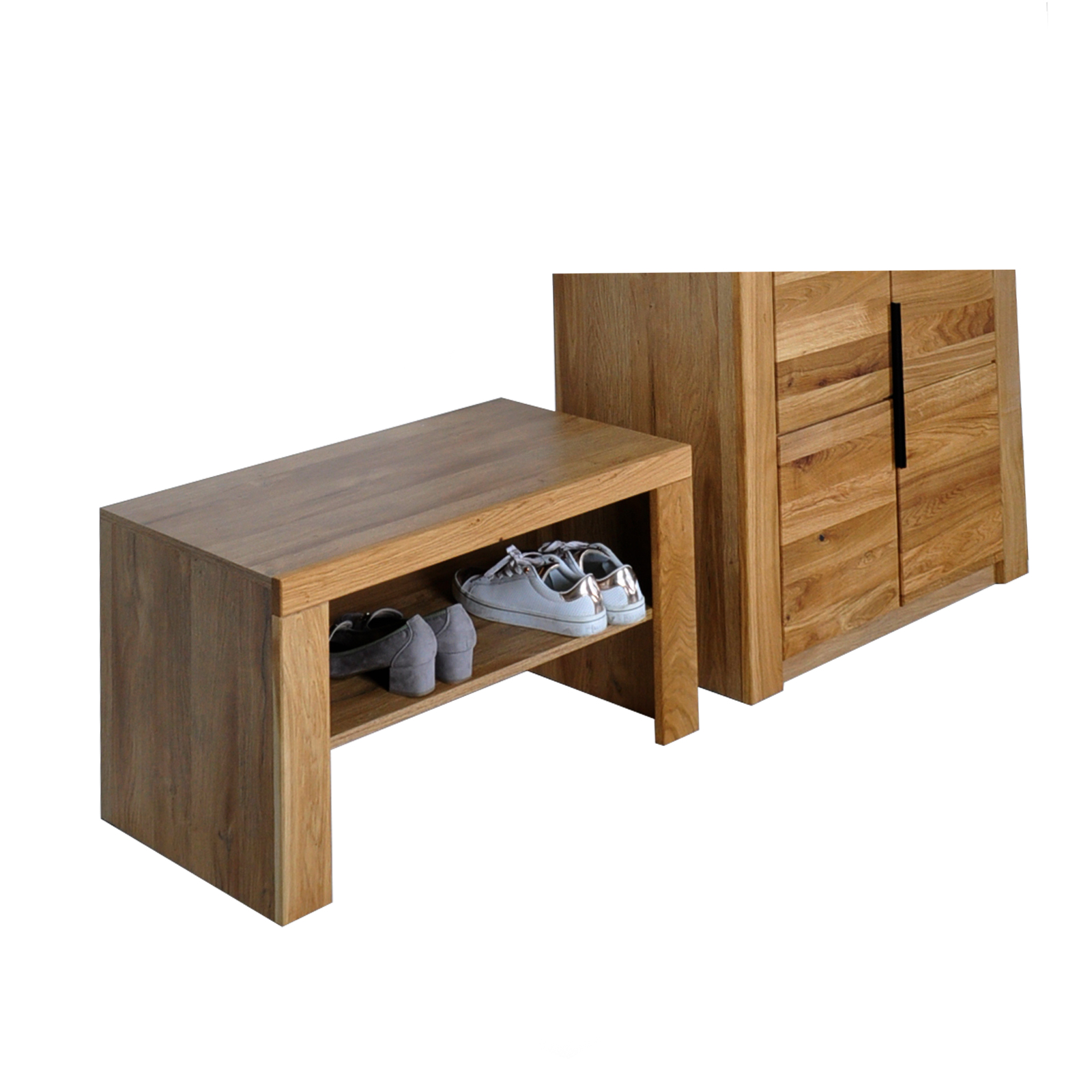 Die Schuhbank besteht aus massiven, geölten Fronten aus Eiche , Korpus und Rest in Eiche Nachbildung.