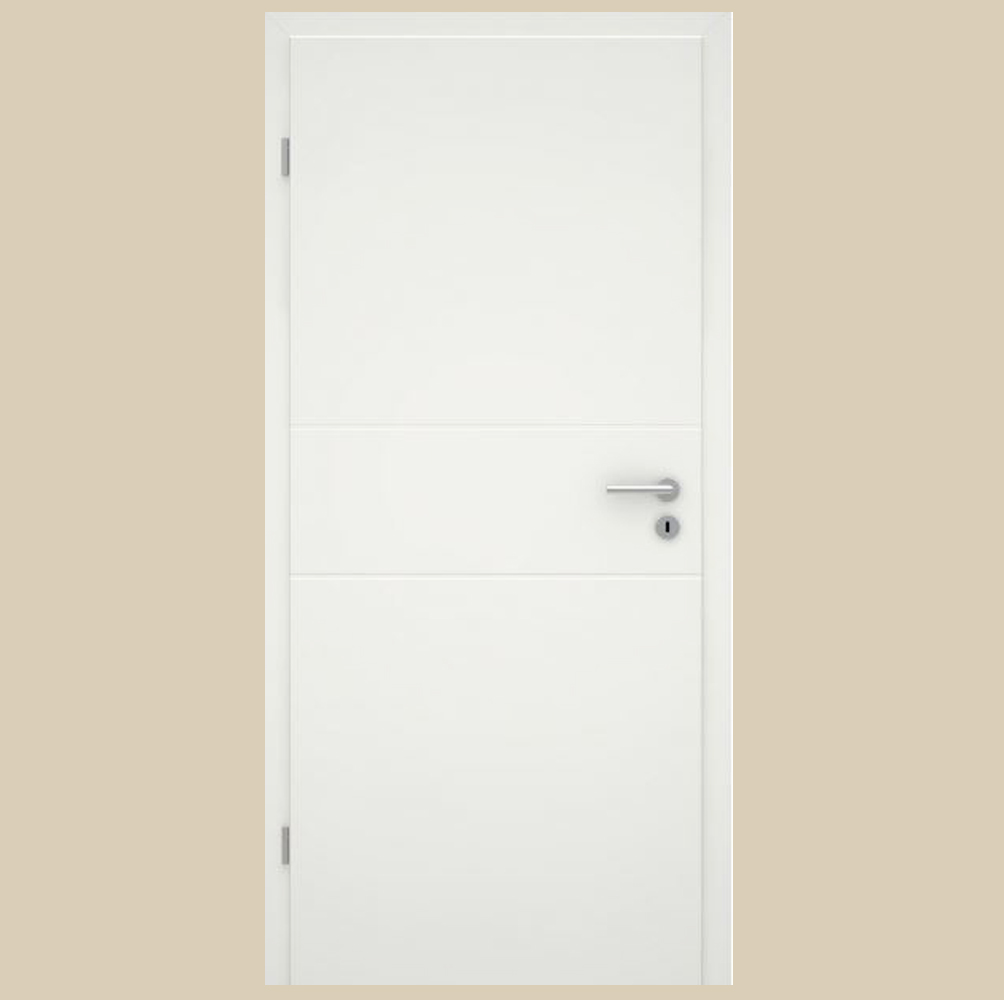 Die matt-weiß schimmernde Lackoberfläche in Weißlack 1.0, angelehnt an RAL 9010, verleiht dieser Tür einen edlen Look mit Wohlfühl-Charakter. Kein Wunder, dass sie zu den beliebtesten weißen Innentüren zählt. Die Designtür besticht durch zwei filigrane, jeweils 10 mm breite, horizontal verlaufende Rillen, die ihrer Oberfläche eine dezente und moderne Struktur verleihen. Das Türblatt mit rechtwinkliger Eckkante unterstreicht den geradlinigen, zeitlosen Charakter dieser eleganten Innentür.